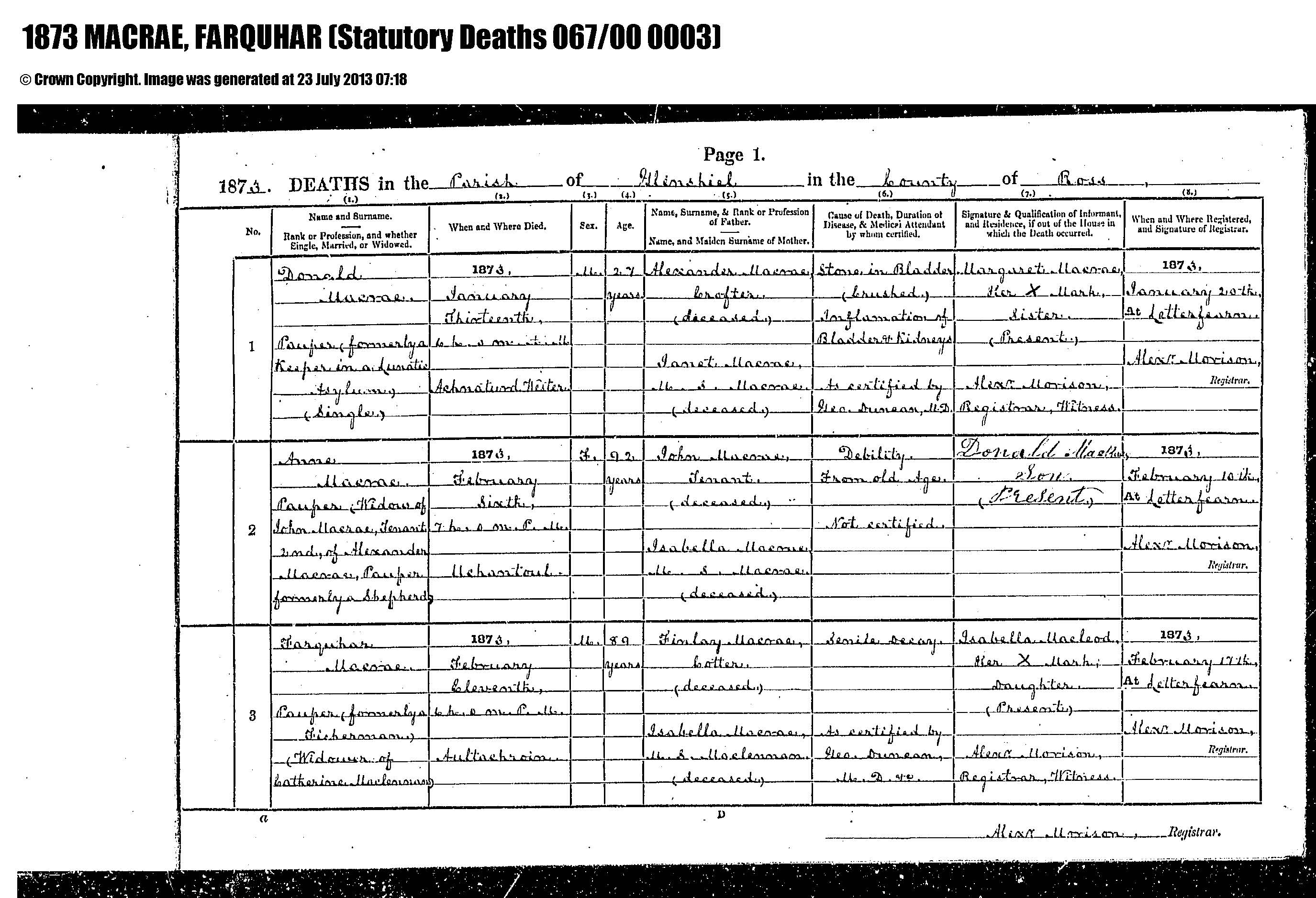 1. The Scotland Statutory Death Register for Farquhar MacRae (1873)